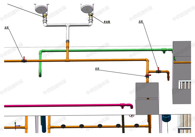 3、根據(jù)安裝圖,連接管道,設(shè)備就位后連接管道用橡皮墊緊固好,使連接處不滲漏。
